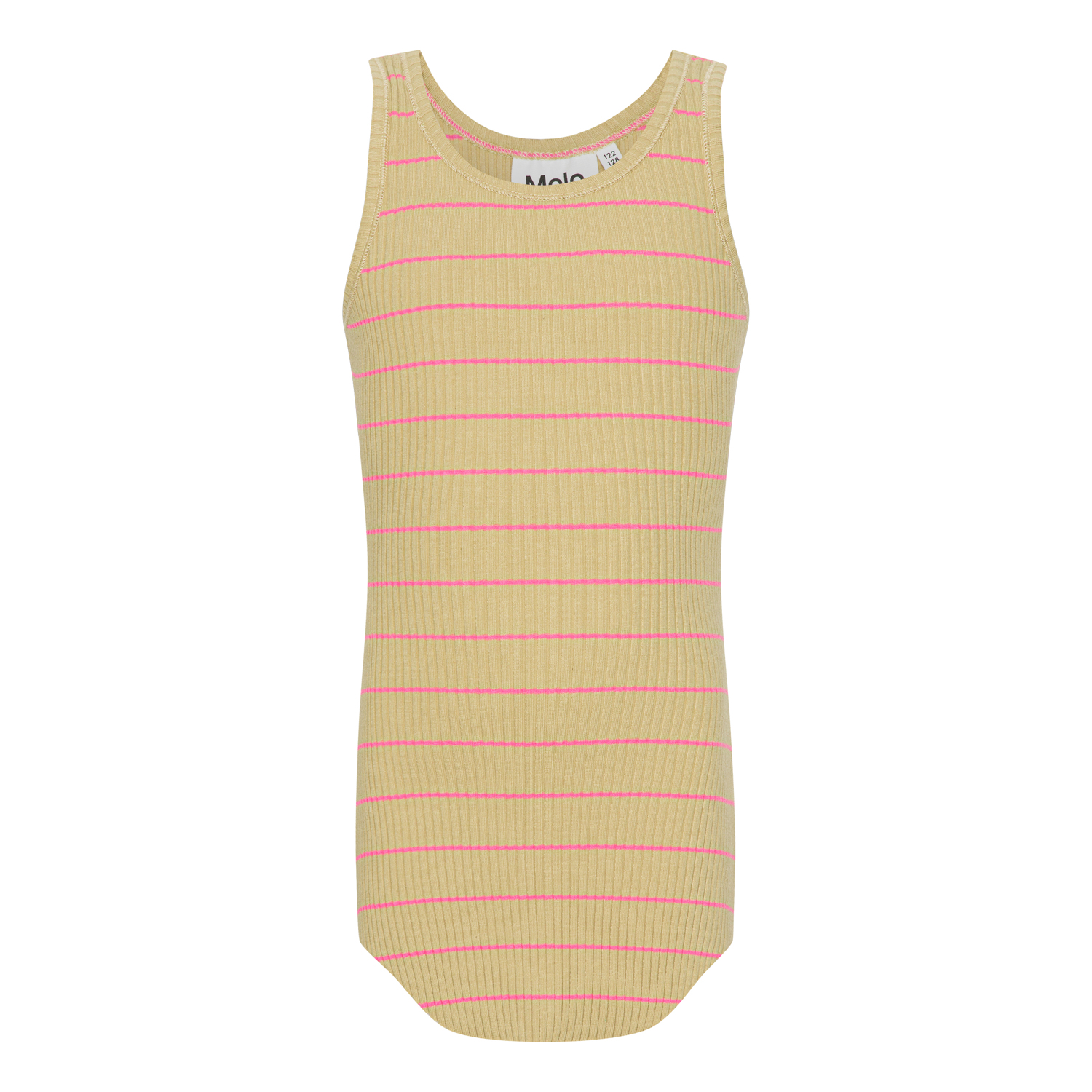 Roberta ist das perfekte Tanktop aus Öko-Baumwolle. Das Oberteil ist staubgelb mit dünnen rosa Streifen, die es lustig und cool machen. Das Oberteil ist gerippt und fällt vorne und hinten weiter nach unten.