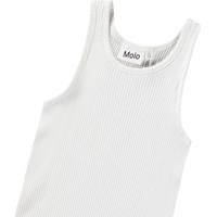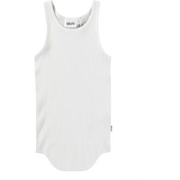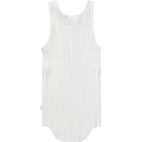 Weißes Tanktop aus weichem Öko-Baumwollripp mit rundem Ausschnitt. Das Top hat eine eng anliegende Form, mittelbreite Träger und einen rohen abgerundeten Saum unten.