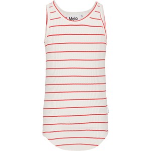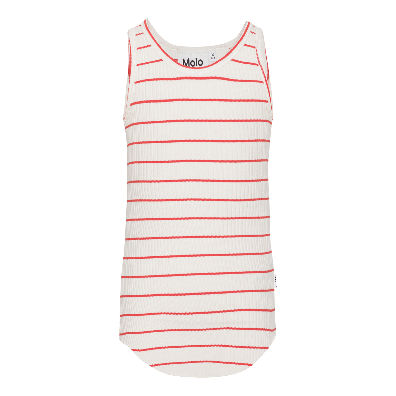 Weißes Tanktop mit roten Streifen, aus weicher Öko-Baumwolle in Stretch-Rippstrick. Das Oberteil hat eine enge Passform und unten einen runden Saum.