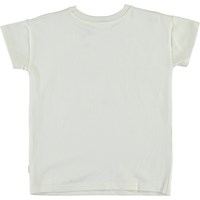 Robine ist ein weißes T-Shirt mit rotem Paisley-Druck auf der Vorderseite. Das T-Shirt hat einen Rundhalsausschnitt und kurze Ärmel.
