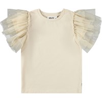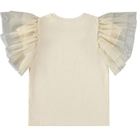 Off-White T-Shirt aus weicher Baumwolle mit geripptem Halsausschnitt. Das T-Shirt hat eine lockere Passform und 3 Lagen Tüllärmel, die sich schön über die Schulter legen.