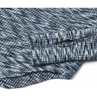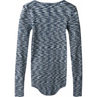 Langärmeliges Oberteil aus dehnbarem, biologischem Baumwollripp mit einer eng anliegenden Passform, einem Rundhalsausschnitt und rohen Kanten an beiden Ärmeln mit Daumenlöchern. Das Oberteil ist in Blau und Weiß gewebt, was ein schönes Muster ergibt. Zusätzlich hat das Oberteil eine vertikale Naht in der Mitte des Rückens und einen rohen, abgerundeten Saum an der Taille.