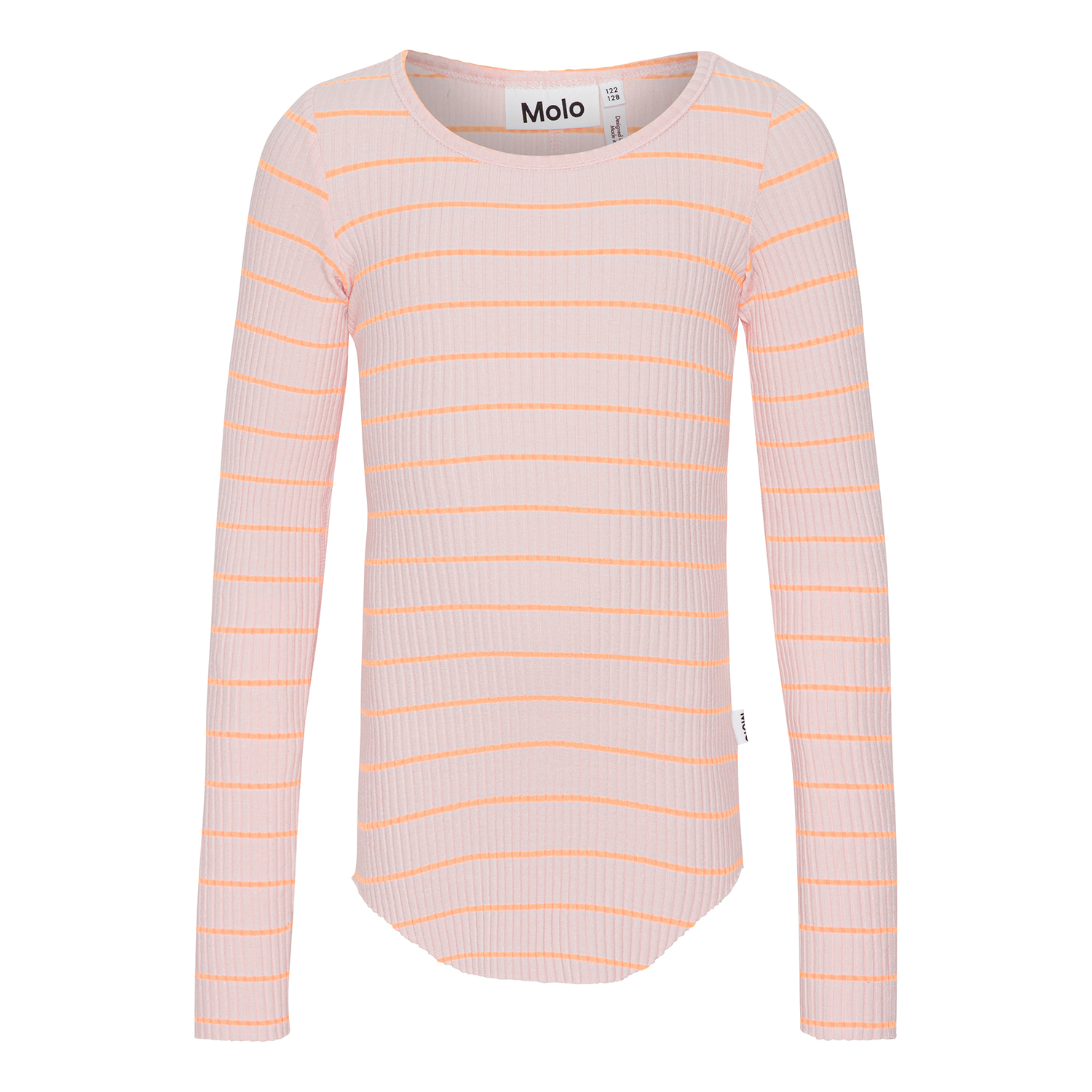 Hellkorallenfarbenes Langarmshirt mit orangefarbenen Neonstreifen. Das Shirt besteht aus weicher Öko-Baumwolle in Stretch-Rippstrick. Das Shirt hat eine enge Passform und einen Rundhalsausschnitt. Rohkanten an beiden Ärmeln und mit einem Loch für den Daumen. Eine durchgehende vertikale Naht in der Mitte des Rückens und eine rohe, abgerundete Kante unten.