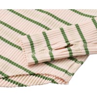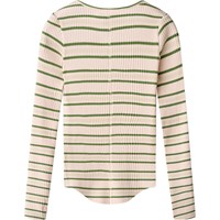 Gestreiftes langärmeliges Oberteil aus dehnbarem Öko-Baumwollripp. Das Oberteil hat eine enge Passform, einen runden Halsausschnitt, rohe Kanten am Saum und an den Ärmeln sowie Daumenlöcher.