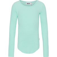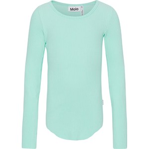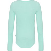 Mintfarbenes Langarmshirt aus weicher Öko-Baumwolle in elastischem Rippstrick. Das Shirt hat eine enge Passform und einen Rundhalsausschnitt. Rohkanten an beiden Ärmeln und mit einem Loch für den Daumen. Eine durchgehende vertikale Naht in der Mitte des Rückens und eine rohe, abgerundete Kante unten.