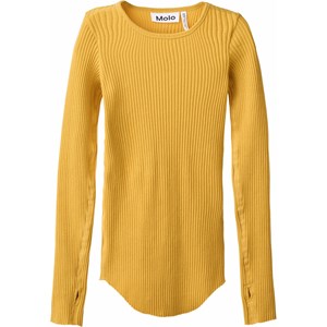 Gelbes Langarmshirt aus elastischem, biologischem Baumwollripp mit enganliegendem Schnitt, einem Rundhalsausschnitt und offenen Kanten an beiden Ärmeln mit Daumenlöchern. Darüber hinaus hat das Oberteil eine vertikale Naht in der Mitte des Rückens und einen offenen, abgerundeten Saum an der Taille.