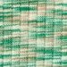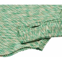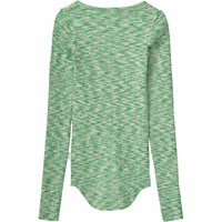 Langärmeliges Oberteil aus dehnbarem Öko-Baumwollripp mit enganliegender Passform, Rundhalsausschnitt, rohen Kanten an beiden Ärmeln mit Daumenlöchern. Das langärmelige Oberteil hat eine vertikale Naht in der Mitte des Rückens und einen rohen, abgerundeten Saum unten. Das Oberteil ist in grün, weiß und hellbraun gewebt und schafft eine schöne Textur.