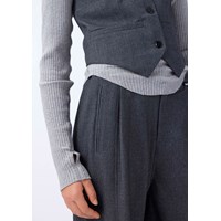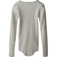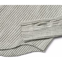 Graues Langarmshirt aus dehnbarem, biologischem Baumwollripp mit eng anliegendem Schnitt, einem Rundhalsausschnitt und rohen Kanten an beiden Ärmeln mit Daumenlöchern. Darüber hinaus hat das Oberteil eine vertikale Naht in der Mitte des Rückens und einen rohen, abgerundeten Saum an der Taille.
