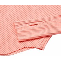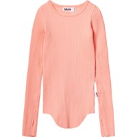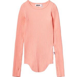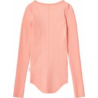 Hellorangefarbenes Langarm-Top aus elastischem Öko-Baumwollripp mit enganliegender Passform, Rundhalsausschnitt, rohen Kanten an beiden Ärmeln mit Daumenlöchern. Das Langarm-Top hat eine vertikale Naht in der Mitte des Rückens und einen rohen, abgerundeten Saum unten.