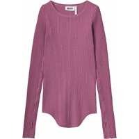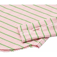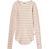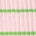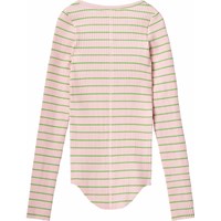 Rosa und grün gestreiftes Langarm-Top aus elastischem Öko-Baumwollripp mit enganliegender Passform, Rundhalsausschnitt, rohen Kanten an beiden Ärmeln mit Daumenlöchern. Das Langarm-Top hat eine vertikale Naht in der Mitte des Rückens und einen rohen, abgerundeten Saum unten.