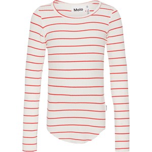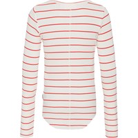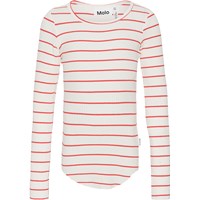 Rot-weiß gestreiftes Langarmshirt aus weicher Öko-Baumwolle in elastischem Rippstrick. Das Shirt hat eine enge Passform und einen Rundhalsausschnitt. Rohkanten an beiden Ärmeln und mit einem Loch für den Daumen. Eine durchgehende vertikale Naht in der Mitte des Rückens und eine rohe, abgerundete Kante unten.