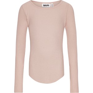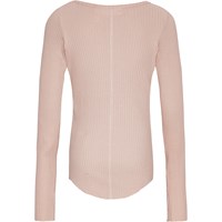 Pulverfarbenes Langarmshirt aus dehnbarem Öko-Baumwollripp mit enganliegender Passform, Rundhalsausschnitt, rohe Kanten an beiden Ärmeln mit Daumenlöchern. Eine vertikale Naht verläuft in der Mitte des Rückens und am unteren Rand gibt es eine rohe, abgerundete Kante.