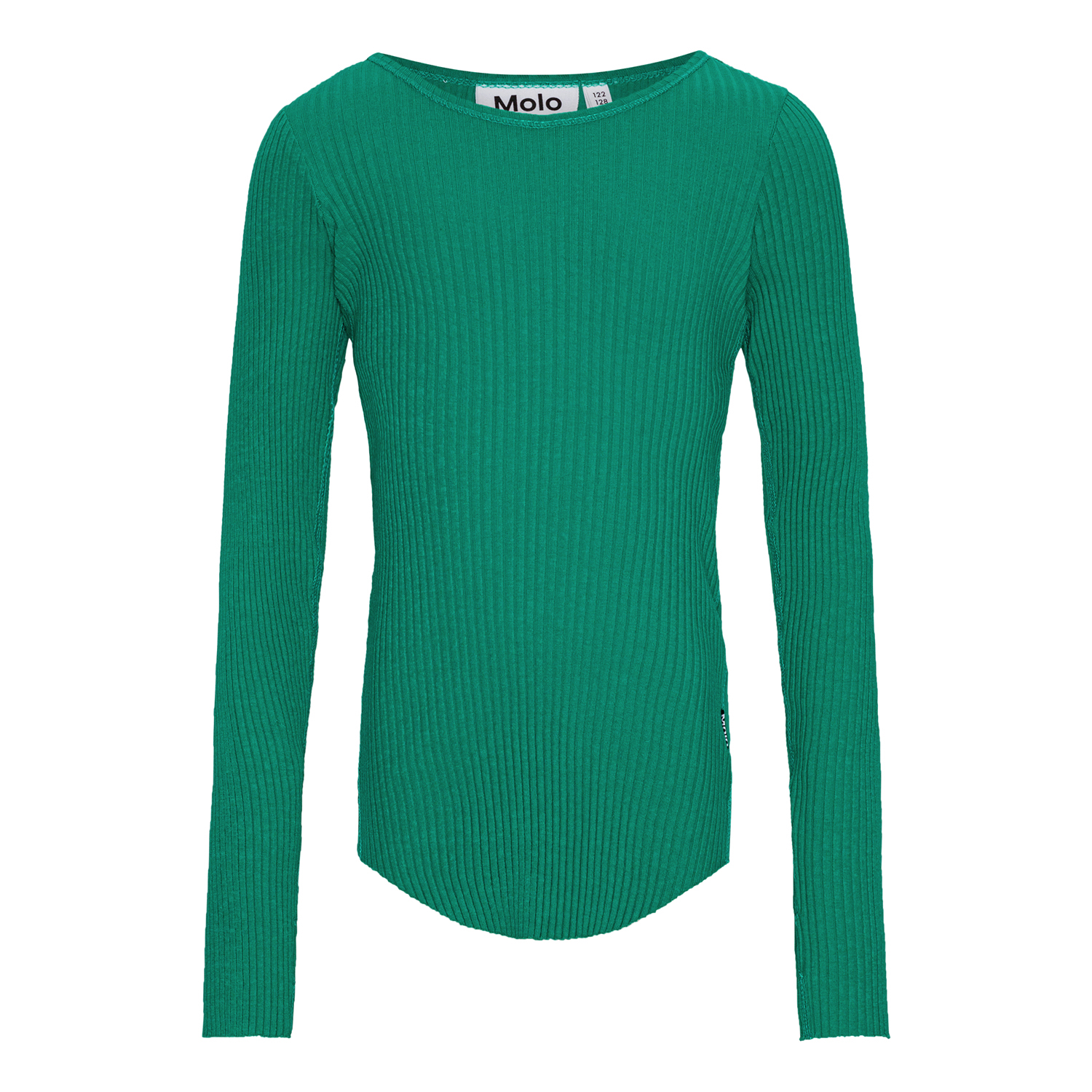 Grüne langärmelige Bluse aus dehnbarem Öko-Baumwollripp mit enganliegender Passform, Rundhalsausschnitt, rohen Kanten an beiden Ärmeln mit Daumenlöchern. Vertikale Nähte verlaufen entlang der Mitte des Rückens und ein roher, abgerundeter Saum am unteren Ende.
