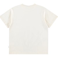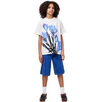Weißes T-Shirt aus Öko-Baumwolle mit kurzen Ärmeln und geripptem Halsausschnitt. Das T-Shirt hat eine lockere Passform mit einem Druck von blauen Blumen.