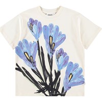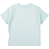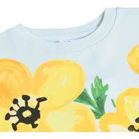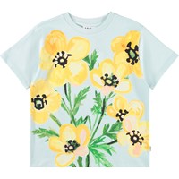 Hellblaues T-Shirt aus Öko-Baumwolle mit kurzen Ärmeln und geripptem Halsausschnitt. Das T-Shirt hat eine lockere Passform mit einem Druck von gelben Blumen.