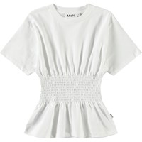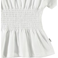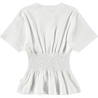 Weißes T-Shirt aus Öko-Baumwolle mit kurzen Ärmeln und geripptem Ausschnitt. Das T-Shirt hat eine geraffte Taille, die einen schönen Abschluss bildet.