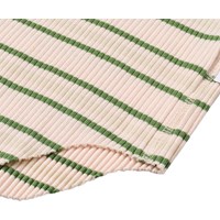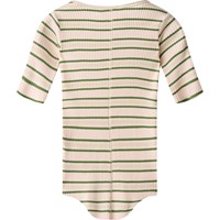 Gestreiftes T-Shirt aus dehnbarem Öko-Baumwollripp. Das T-Shirt hat eine enge Passform mit Rundhalsausschnitt und einem rohen Saum am unteren Rand.