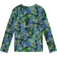 Passende langärmelige grüne Bluse aus Öko-Baumwolle mit Rundhalsausschnitt. Die Bluse hat ein Allover-Muster aus blau-lila Schmetterlingsbüschen mit lebendigen fliegenden Schmetterlingen.