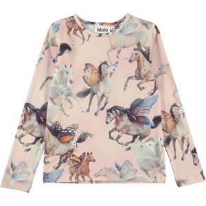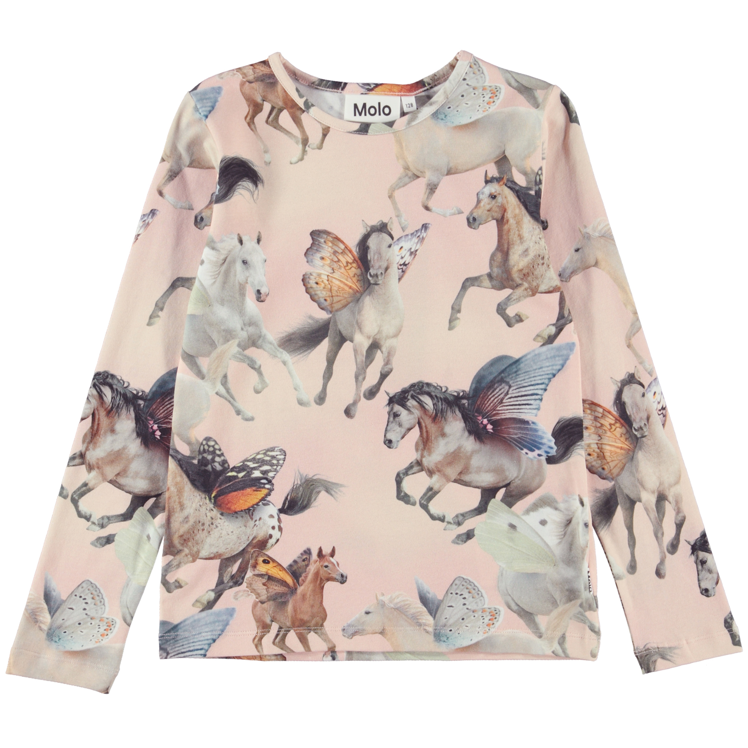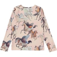 Rose ist eine langärmlige Bluse aus Öko-Baumwolle. Rose ist überall mit Fairy Horses bedruckt, mit galoppierenden Pferden mit Schmetterlingsflügeln.
