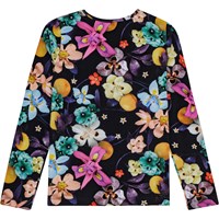 Eng anliegendes Langarmshirt in Öko-Baumwolle mit Rundhalsausschnitt. Das Oberteil ist mit einem Druck von lebendigen Blumen in frischen Farben versehen, die wunderschön gegen den schwarzen Hintergrund hervorstechen.