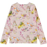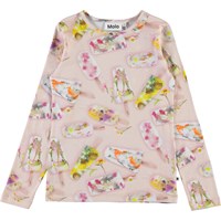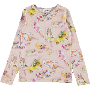 Rose ist ein langärmeliger Pullover mit Eis-Druck. Molo hat selbst diese schönen Blumen zu Eis gefroren, die diesen Aufruck ausmachen. Der Pullover hat ganz kurze Ärmel und graue Kantenbänder. Ecocert Greenlife, certifikationsnr. 197496.