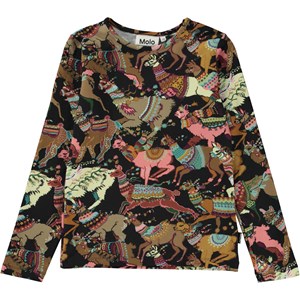 Schwarzes Langarmshirt mit Allover Lama Print. Der Druck besteht aus niedlichen und lustigen Lamas, die voller Humor sind. Sie tragen Molos eigene Strickmodelle und haben sich gut in Mützen, Halswärmer und Pullover eingehüllt. Dieses Shirt ist aus 100% Baumwolle, hat lange Ärmel mit Rippbündchen, einen Rundhalsausschnitt mit Rippbündchen und eine normale Passform..