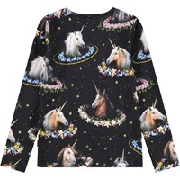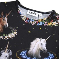 Schwarzes Langarmshirt aus Bio-Baumwolle mit Rundhalsausschnitt und Saumband. Das eng anliegende Langarmshirt ist mit Einhörnern und bunten Blumenkränzen bedruckt.