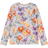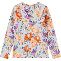 Hellblaues, langärmeliges Oberteil aus Bio-Baumwolle mit Rundhalsausschnitt und Saumband. Das langärmelige Oberteil ist enganliegend und hat einen Aufdruck bunter Papierblumen.