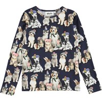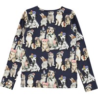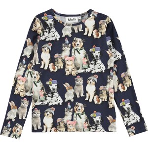 Rose ist ein dunkelblaues Langarmshirt mit Aufdrucken verschiedener Haustiere mit Mütze oder Stirnband.