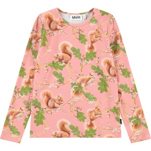 Rosa Langarmshirt aus Bio-Baumwolle mit Rundhalsausschnitt und Abschlussbund. Das eng anliegende Langarmshirt hat einen Aufdruck von Eichhörnchen, die auf schönen Eichenzweigen sitzen.