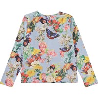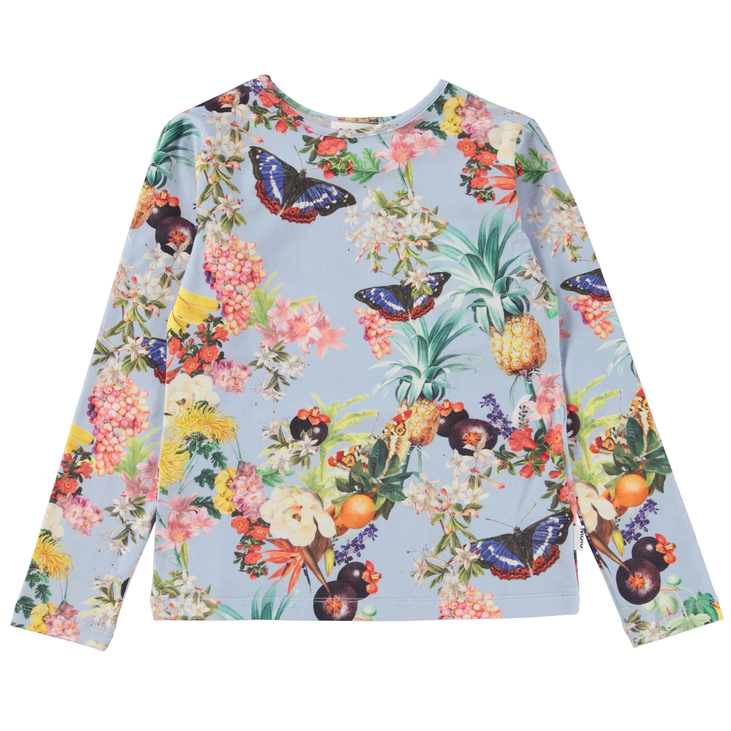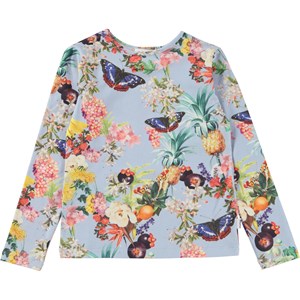 Rose ist eine langärmlige Bluse aus Öko-Baumwolle. Rose ist überall mit tropischen Früchten bedruckt, mit Ranken aus tropischen Früchten, tropischen Blumen und Schmetterlingen.