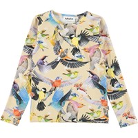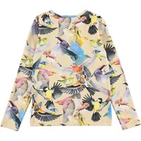 Rose ist ein hellgelbes Langarmshirt mit Aufdrucken verschiedener bunter Vögel.