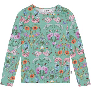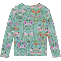 Grünes Langarmshirt aus Öko-Baumwolle. Das Shirt ist eng anliegend, hat einen Rundhalsausschnitt und einen mehrfarbigen Allover-Print aus Herzen aus Insekten und wilden bunten Blumen.