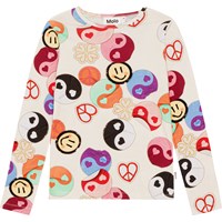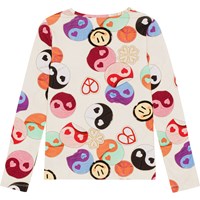Weißes Langarmshirt aus Öko-Baumwolle. Das Shirt ist eng anliegend, hat einen Rundhalsausschnitt und ist mit einem mehrfarbigen Allover-Print aus Yin- und Yang-Stickern versehen.