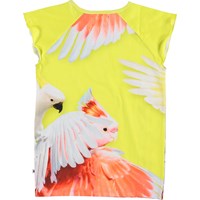 Rosetta ist ein gelbes T-Shirt mit sehr kurzen Ärmeln und Papageiendrucken.
