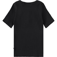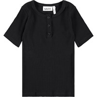 Schwarzes, eng anliegendes T-Shirt aus weichem Viskose-Ripp mit rundem Ausschnitt und drei passenden Knöpfen vorne.
