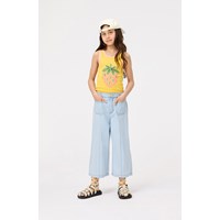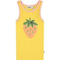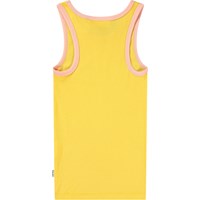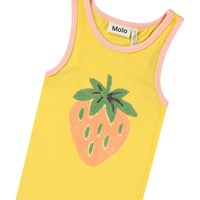 Gelbes figurbetontes Tanktop aus Öko-Baumwolle mit rosa Besatz entlang des Ausschnitts und der Armlöcher. Das Oberteil zeigt einen Frontdruck einer grünen und orangefarbenen Erdbeere.