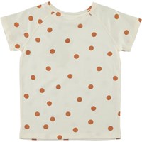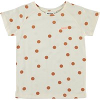 Rozalia ist eine helles T-shirt mit einem Druck von braunen Punkten und einem rosa Molo-Logo auf der Brust.