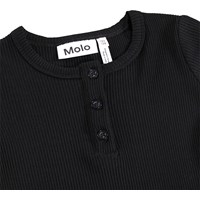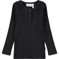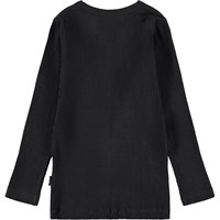 Schwarzes, eng anliegendes Oberteil mit langen Ärmeln aus weichem Viskoseripp. Das Oberteil hat einen runden Ausschnitt und drei passende Knöpfe vorne.