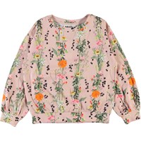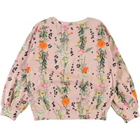 Ryba ist ein pinker Pullover mit langen Ärmeln und Druck von vertikalen Blumernreben. Der Pullover hat leichte Puffärmel mit Schlag und elastische Rippkante unten und am Ärmelende. Ecocert Greenlife, certifikationsnr. 197496.