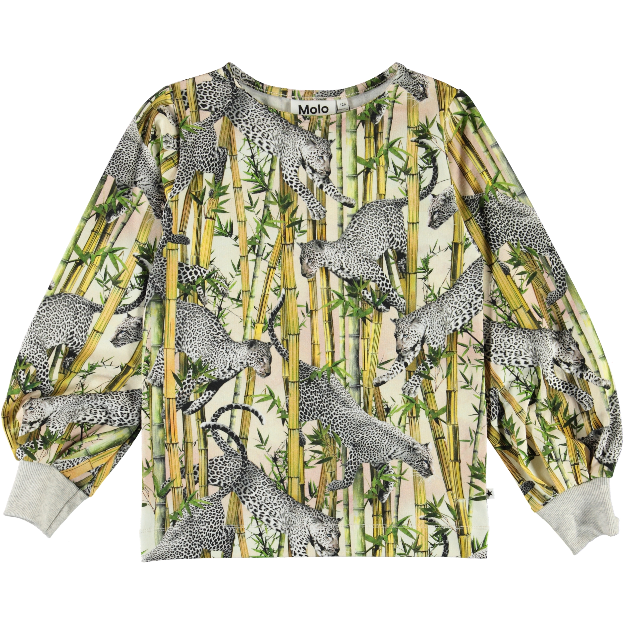 Rylee ist eine Langarmbluse mit Puffärmeln und dem Print 'Flying Leopard'.