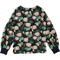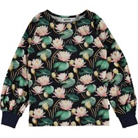 Ryle ist ein langärmeliger Pullover mit einem Aufdruck von rosa Seerosen auf dunklem Hintergrund. Der Pullover hat breite Ärmel mit einer elastischen Rippkante am Ärmelende.