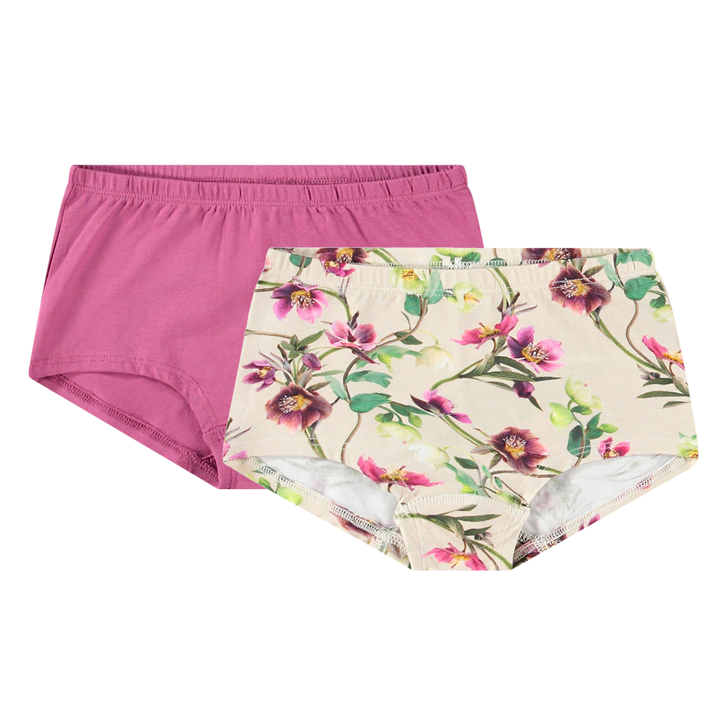 2er-Pack Slips aus Öko-Baumwolle. Ein Paar ist in Rosa und das andere Paar hat ein Allover-Muster aus Weihnachtsrosen in verschiedenen Rosa- und Weißtönen. Kann mit passenden Tanktops kombiniert werden, um ein komplettes Set zu erstellen.