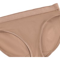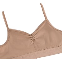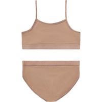 Hellbraunes Unterwäscheset aus weicher und dehnbarer Viskose. Das Oberteil hat dünne elastische Träger und eine geraffte Naht vorne, die dem Oberteil einen schönen Schnitt verleiht. Sowohl das Oberteil als auch das Unterteil haben ein breites elastisches Band, um eine gute Passform und angenehmen Tragekomfort zu gewährleisten.