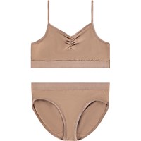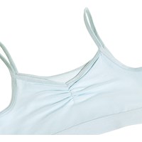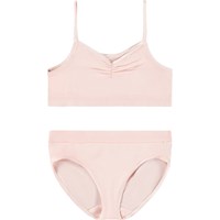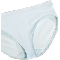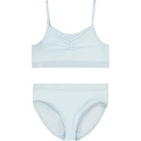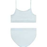 Hellblaues Unterwäscheset aus weicher und dehnbarer Viskose. Das Oberteil hat dünne elastische Träger und eine geraffte Naht vorne, die dem Oberteil einen schönen Schnitt verleiht. Sowohl das Oberteil als auch das Unterteil haben ein breites elastisches Band, um eine gute Passform und angenehmen Tragekomfort zu gewährleisten.
