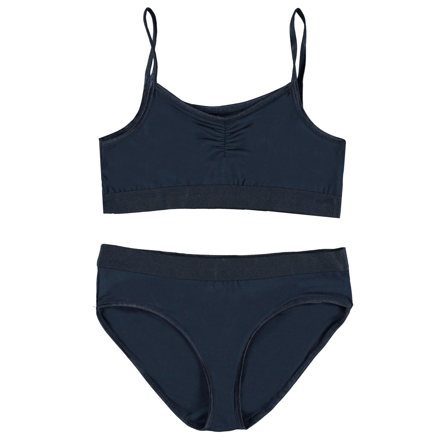 Dunkelblaues Unterwäscheset. Das Set besteht aus 100% Viskose-Jersey und besteht aus einer Unterhose mit breitem Gummizug in der Taille und einem Oberteil mit Trägern und einer Falte auf der Vorderseite. Der weiche Viskose-Jersey hat einen Stretchanteil, der für ein angenehmes Tragegefühl und uneingeschränkte Bewegungsfreiheit sorgt.
