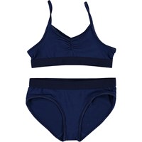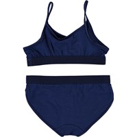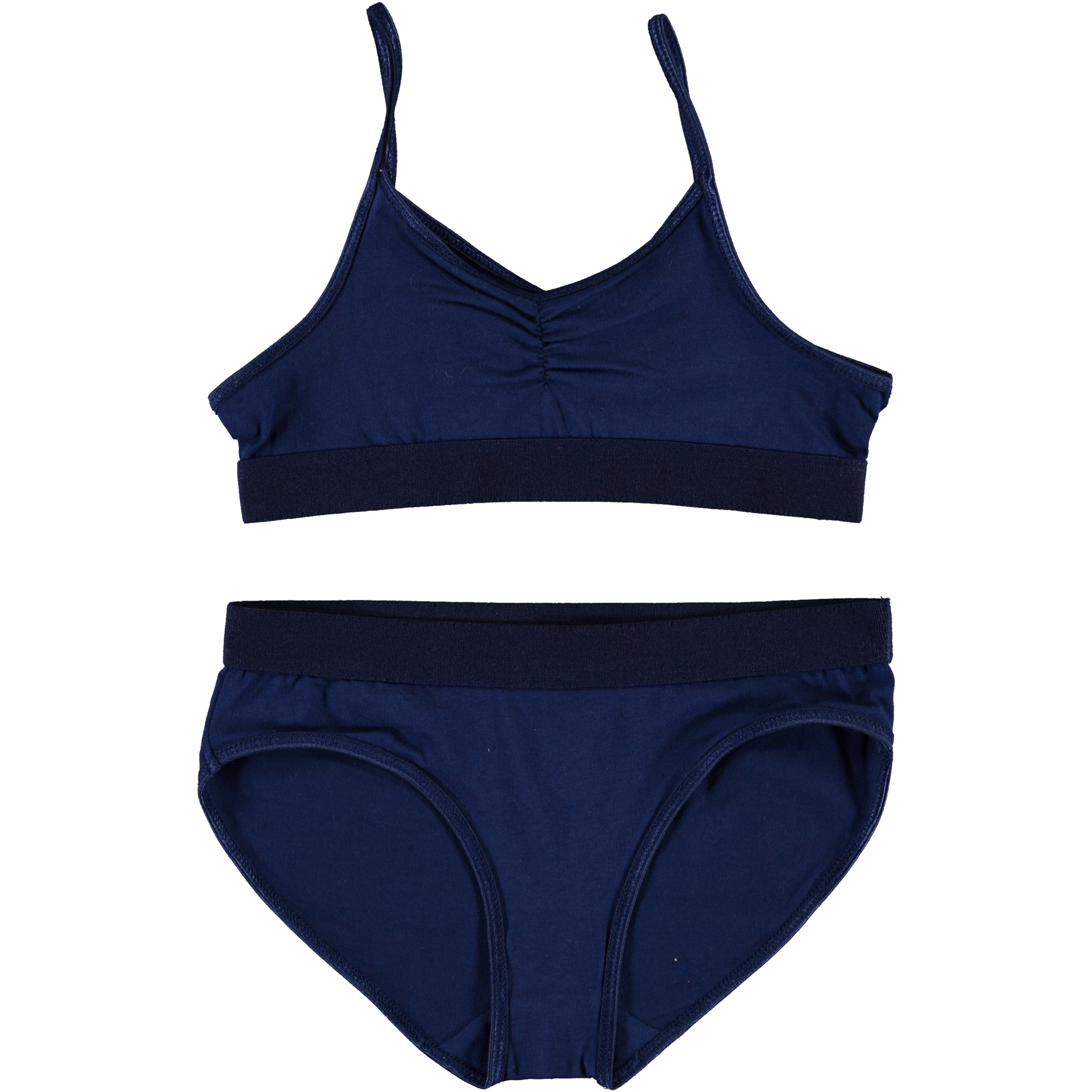 Jinny ist ein Unterwäsche-Set in Blau. Sowohl das Oberteil als auch die Unterhose haben eine breite schwarze elastische Kante, die für eine gute Passform sorgt.