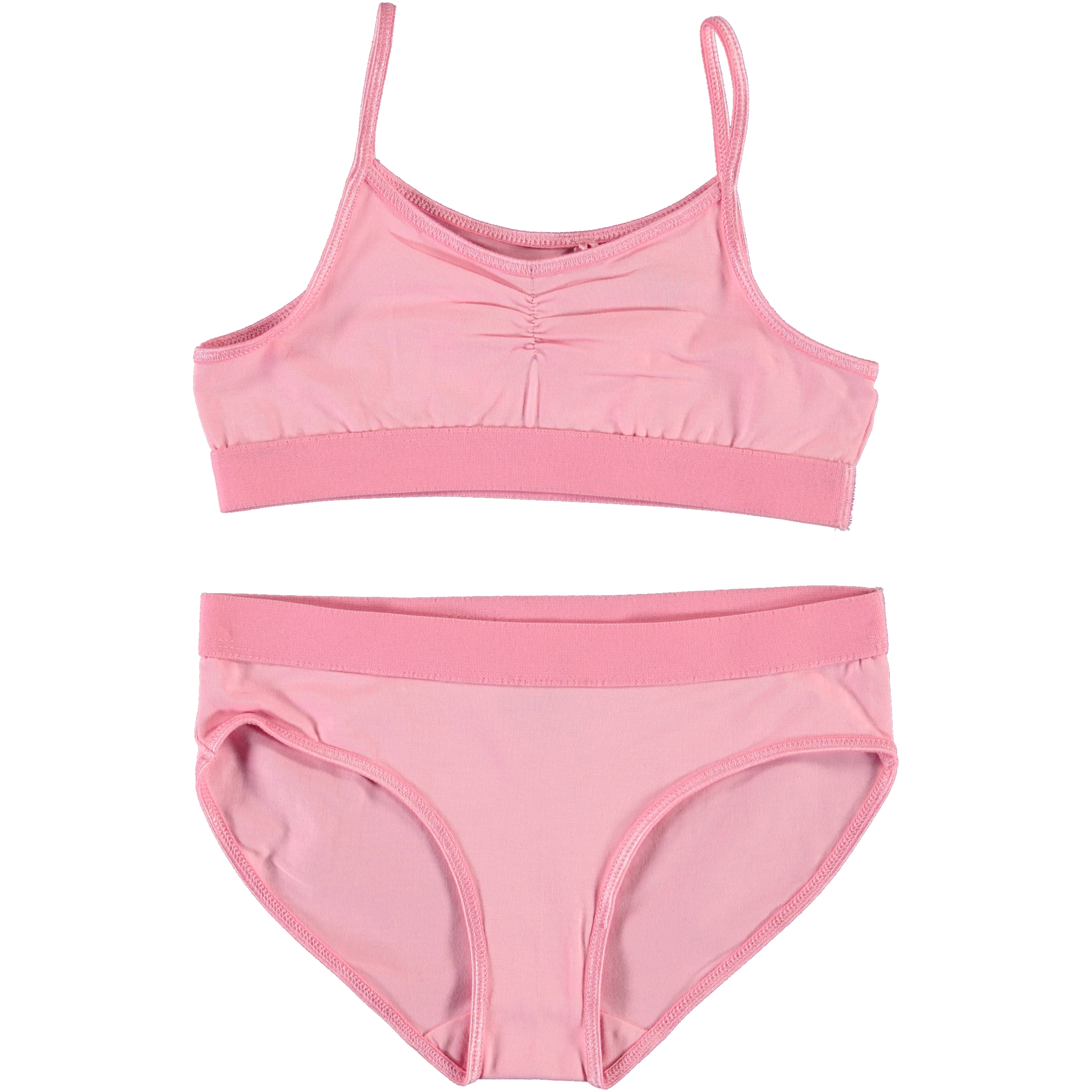 Jinny ist ein Unterwäsche-Set in Rosa. Sowohl das Oberteil als auch die Unterhose haben eine breite schwarze elastische Kante, die für eine gute Passform sorgt.