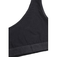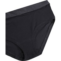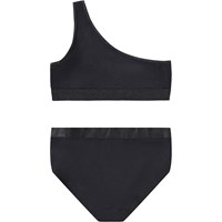 Schwarzes Unterwäscheset aus weicher und dehnbarer Viskose. Das Set besteht aus einem asymmetrischen Oberteil und passenden Slips. Beide Teile haben schmale Gummibänder entlang der Öffnungen und einen breiten Gummibund an der Taille, der einen bequemen und flexiblen Sitz bietet.
