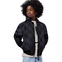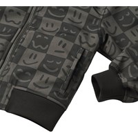 Graue und schwarze karierte wasserabweisende Bomberjacke mit abnehmbarer Kapuze, weichem Fleecefutter und gerippten Kanten an den Ärmeln und am Saum. Die Jacke hat einen Frontreißverschluss, praktische Fronttaschen und einen coolen Druck von lustigen Gesichtern in den kleinen Karos. Ideal für Übergangswetter und aktives Spielen.